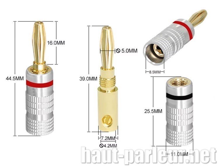 Ces fiches banane acceptent des câbles haut-parleur de 2,5 à 4 mm² ce qui correspond à la très grande majorité est installations.