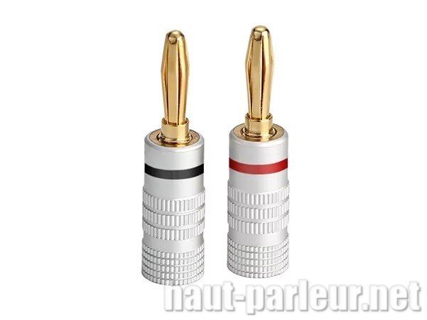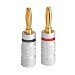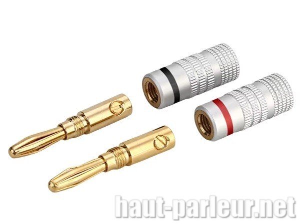 Paire de fiches banane Haute définition à contacts plaqués or 24K. Pour câble d'enceinte 2,5 mm² jusqu'à section 4 mm²