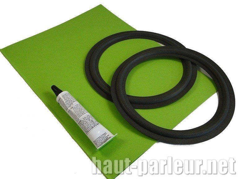 Kit de réparation pour le remplacement de la suspension d'un haut-parleur. Ce kit contient un dissolvant + un lot de 6 pinces à machoires plates et un jeu de 6 cales pour le centrage de la bobine.